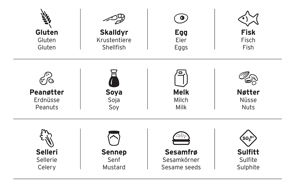 Vi gjør vårt ytterste for å merke våre matretter korrekt. Det kan allikevel forekomme kryss-smitte gjennom håndtering av serveringsbestikk. Ta gjerne kontakt med vårt personell dersom du vil ha ytterligere informasjon.