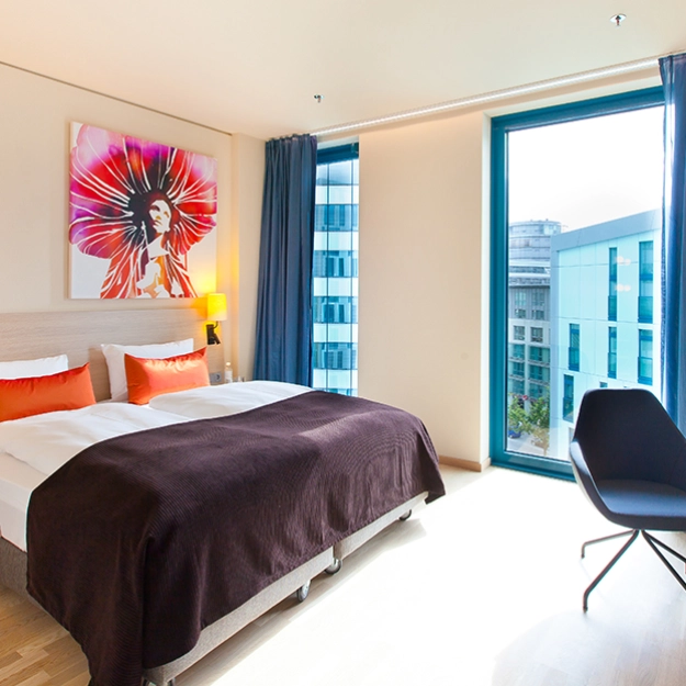 Rom på 24–35 m2 for opp til 2 personer. Rommene er lyse og befinner seg i de øvre etasjene på hotellet med utsikt over byen, hotellatriet eller gaten.
